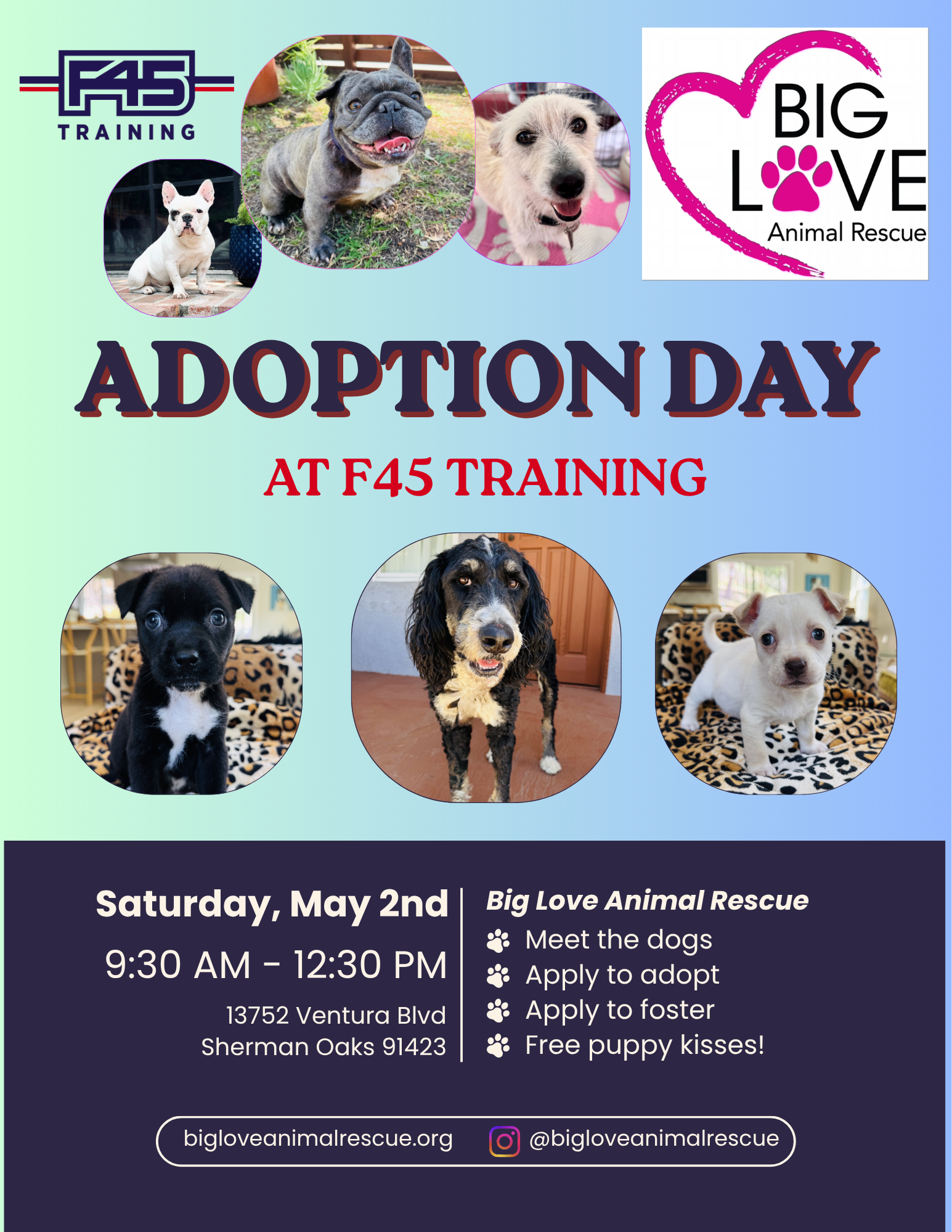 Join us for an adoption day at F45 Training in Sherman Oaks! Meet the dogs, apply to adopt and foster, and maybe even get a workout in!